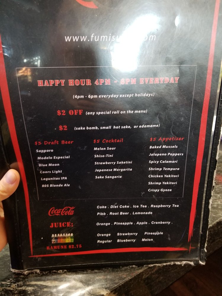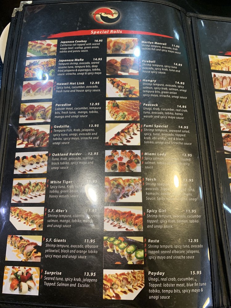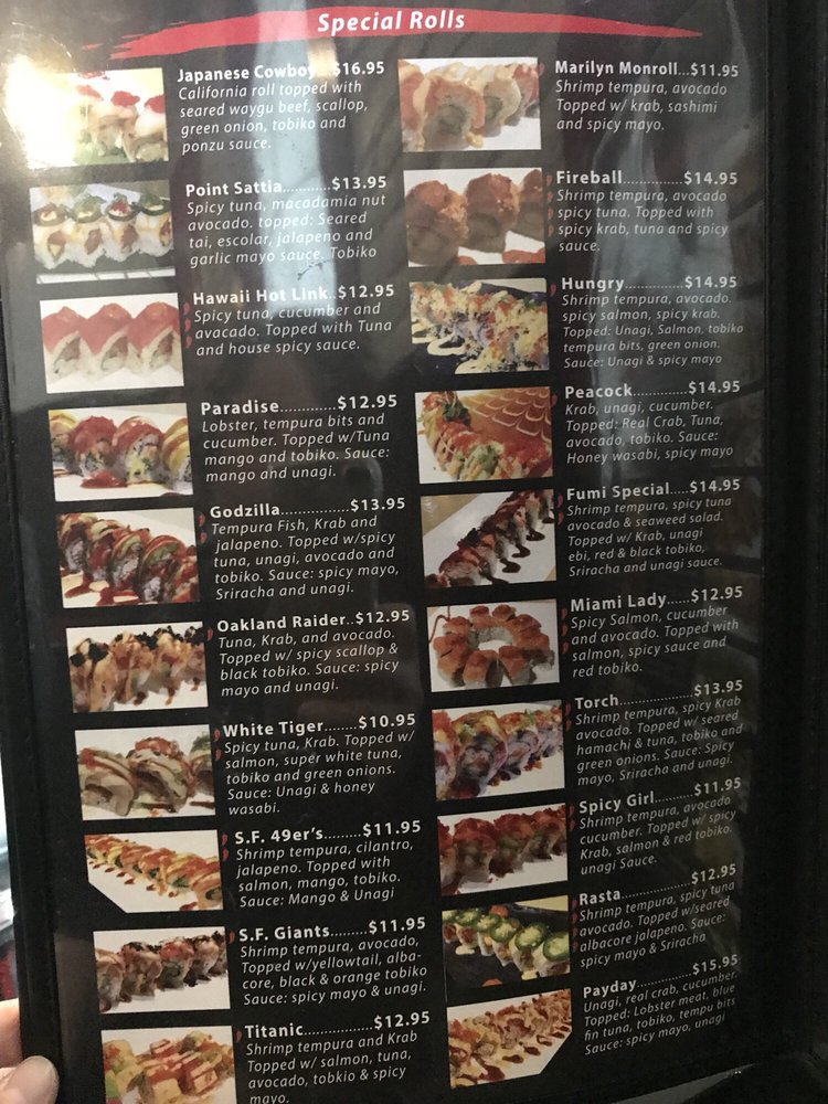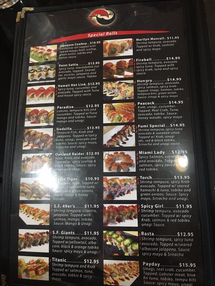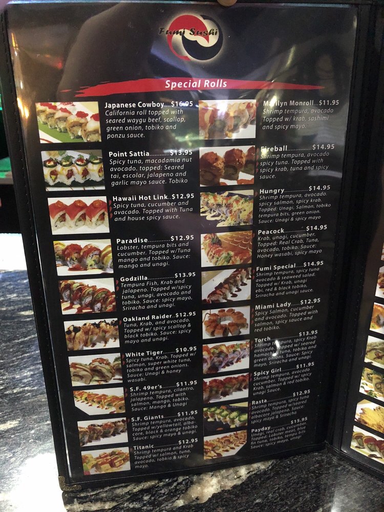 Fumi Sushi Restaurant, located in Modesto, CA, offers a diverse menu with vegan and vegetarian options. The restaurant prides itself on providing a casual dining experience with excellent customer service. Customers rave about the OMG's rolls, hungry roll, and fire cracker roll, highlighting the soft shell crab and fresh ingredients. The Orange Crush, Snow, and Rainbow rolls are recommended favorites, along with the seared ahi tuna and teriyaki bowl. The Titanic roll is a must-try for those looking for a large and delicious dish. The menu also includes unique options like the Marilyn Monroll and walnut shrimp roll. The atmosphere is welcoming with plenty of seating and parking, making it a great spot for lunch, dinner, or happy hour specials. Overall, Fumi Sushi Restaurant is a top choice for fresh and flavorful sushi in the Modesto area.
